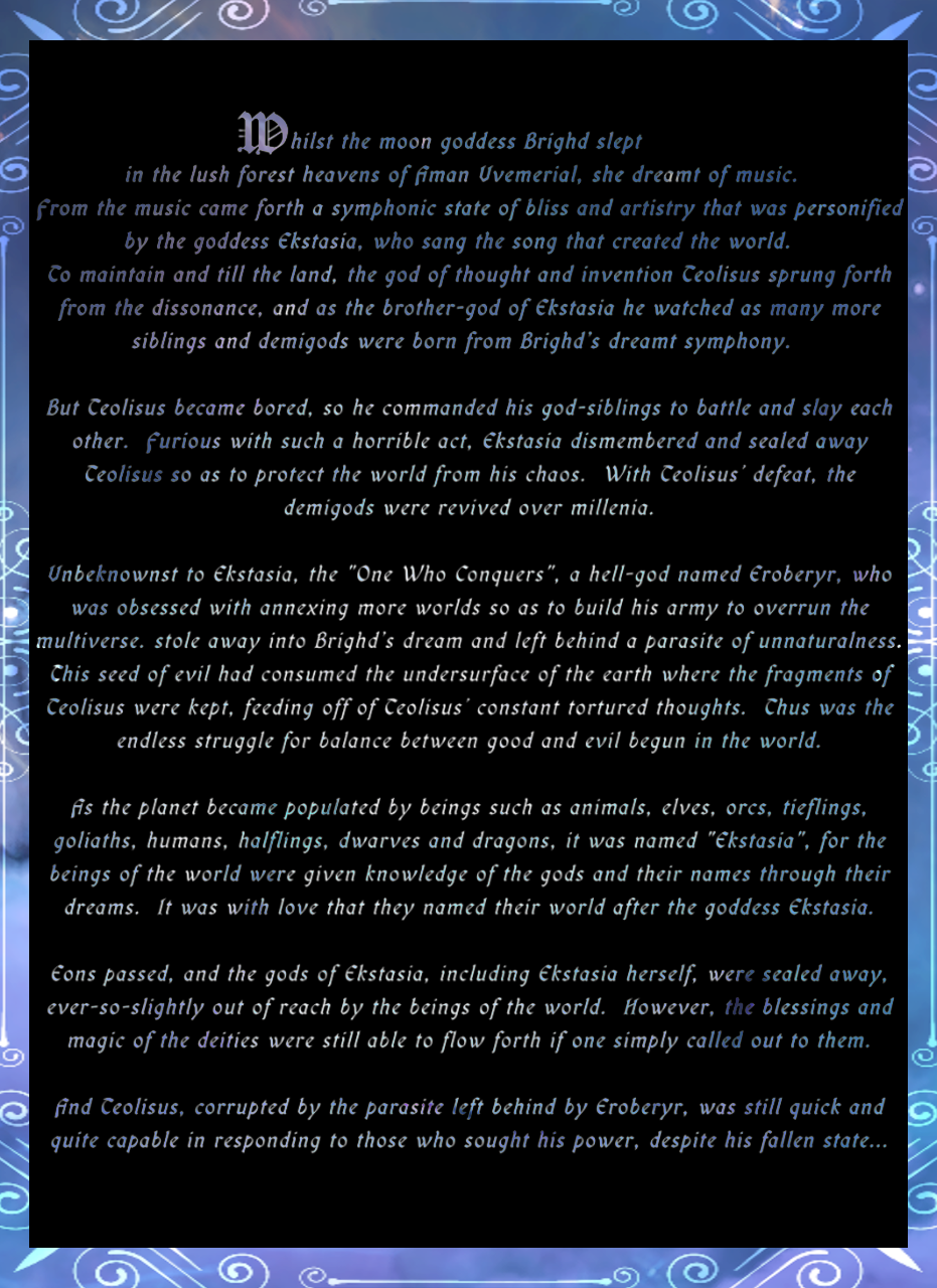 During the Gyrus Dynasty, it was a place where nomadic human warlocks would live largely isolated from each other yet at peace. When the vampire Ilium Guk decided to overthrow the Gyrus Dynasty, he captured an elder from each mage tribe and forced them to summon the ancient earth protector Anurathion, a giant Frog. In doing so, the mages regrouped their powers and sacrificed themselves and their people in order to establish a powerful magic barrier that surrounds what is now known as Zither (from the Carpathinati and Guilty Mountains in the west, to the east coast of modern-day Zither and as far north as O’Beace Mountain. Shortly after the Guk overthrow of Gyrus 1000 years ago, scholars determined the barrier was impenetrable and would stand for at least another 700 years. However, after the Hama rebellion and the establishment of Gy-Guk, this knowledge was lost and all assumed the barrier was still active. During that time, the regions of modern-day Zither were largely uninhabited except for beasts and monsters. Approximately a century and a half ago, after being conquered by the racist human empire Chalkania (otherwise known as the Chalkanium), these elves were exiled from their homeland of Abacus and settled in the largely uninhabited eastern region of the Gyrus Continent. Sequestering themselves off in City-States, they remained largely isolated from the rest of the world until about 100 years ago. In response to the reconsolidation of the Principality of Guk to the west and the lawlessness of the north, the elven city-states established a confederation of trade and treaty and began to open their borders to any and all who would come, so long as they renounce their former national identities. Under the title “Zither”, the name of an ancient ruler of the Abacus Elves who represents the determination of their previously fallen people, the Zither Elves strived to rebuild their culture alongside other oppressed and exiled peoples. Some of the more conservative elves wish to keep Zither isolationist, while the more radical sects wish to see Zither become a world superpower with the goal of elven supremacy. Regrettably, their municipal centers became overrun by corrupt people who tried to dismantle the Zither nation from within, taking their land and wealth for their own gains as opposed to sharing it amongst all. The Abacus / Zither Elves are fierce at combat and diplomacy, and generally are Druids (priest class), Fighters/ Paladins (military class) or Clerics and Commoners (governmental class). The three classes treat each other equally, and their relatively high abilities of diplomacy keeps their dialog with each other free of incident until provoked by a conquering or colonizing force. The Zither elves have established their cities and settlements amongst the crumbling ruins of the ancient Gyrus dynasty which fell 2000 years ago. The governmental class is known as the Clerics of Eilian who facilitate the Assembly of the Ithiliternas (“moon-watchers”). It is led by the Chief Arbiter, a Cleric who outranks the Assembly but has checked powers dependent on the decision-making processes of the House of the Aeredorim (“Noble Lords” overseeing the knight classes) and the House of the Tareideloras (nomadic druid priest class). Most of Zitherian society is divided into these three classes. Commoners who populate Zither adhere to both the druids and the paladins and make their voices heard to the local governors who then move in the Assembly. The Clerics of Eilian are of the Life Domain and venerate the new deity Coinanan but actually receive their powers from a dormant but supportive Ekstasia (she’s rooting for her children!). The military / defender class of zither are the paladin knights, a societal class named the Aeredorim. Half of the Aeredorim are Oath of Vengeance paladins called the Dioltas, and the other half are Oath of the Ancients paladins called the Ceoltas. The priest class are the Circle of the Land druids called the Tareideloras (forest-dwellers). Temperate landscape; mostly forested and green plains. Four seasons.